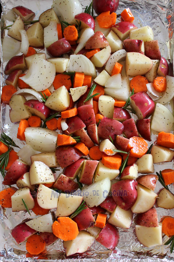 - Colocar las papas, zanahorias y cebollas, agregar las ramas de romero, 2 cucharadas de aceite, sal y pimienta a gusto.