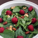 Ensalada de arúgula, espinacas, almendras y frambuesas con salsa de yogurt