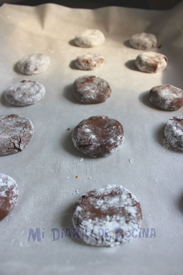Cubrir una bandeja con papel de mantequilla. Con la ayuda de una cuchara para helado formar bolas y pasarlas por azúcar flor, luego colocarlas en la lata y aplastar un poco con los dedos.
