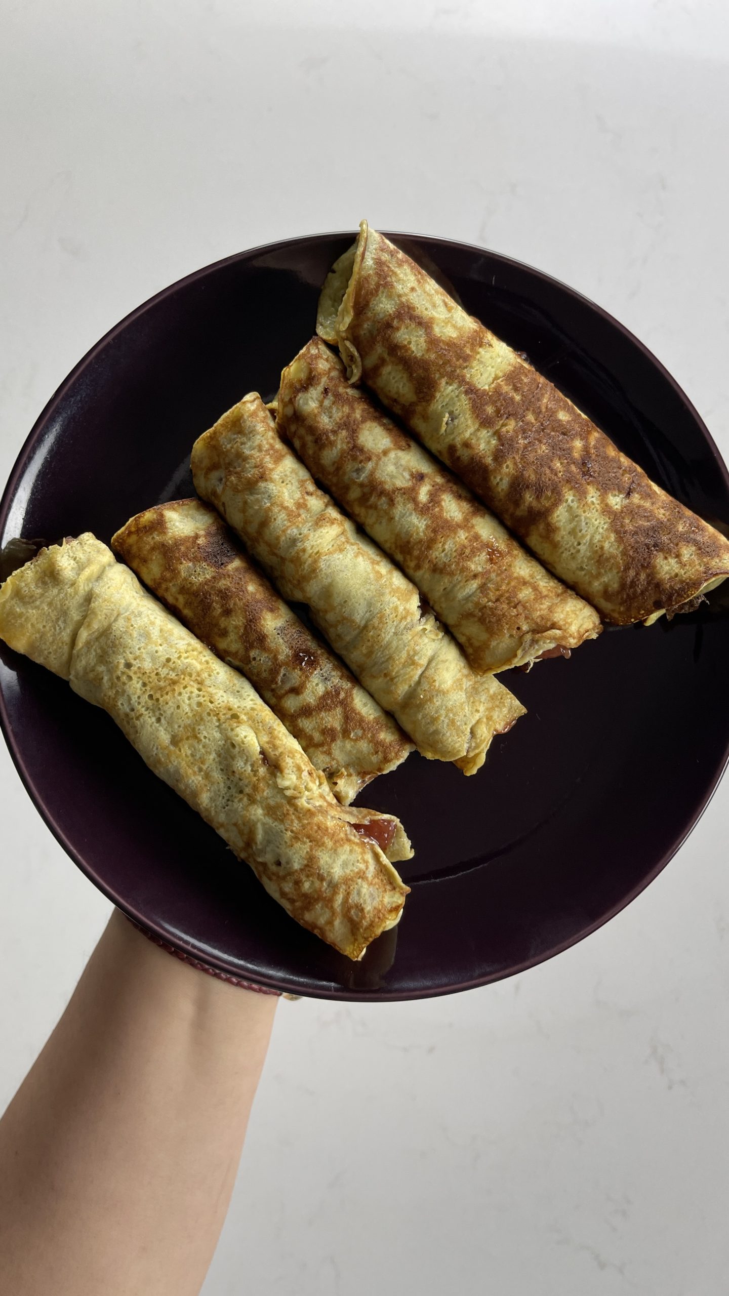 6. Luego rellenar con mermelada de su gusto y enrollar los panqueques.