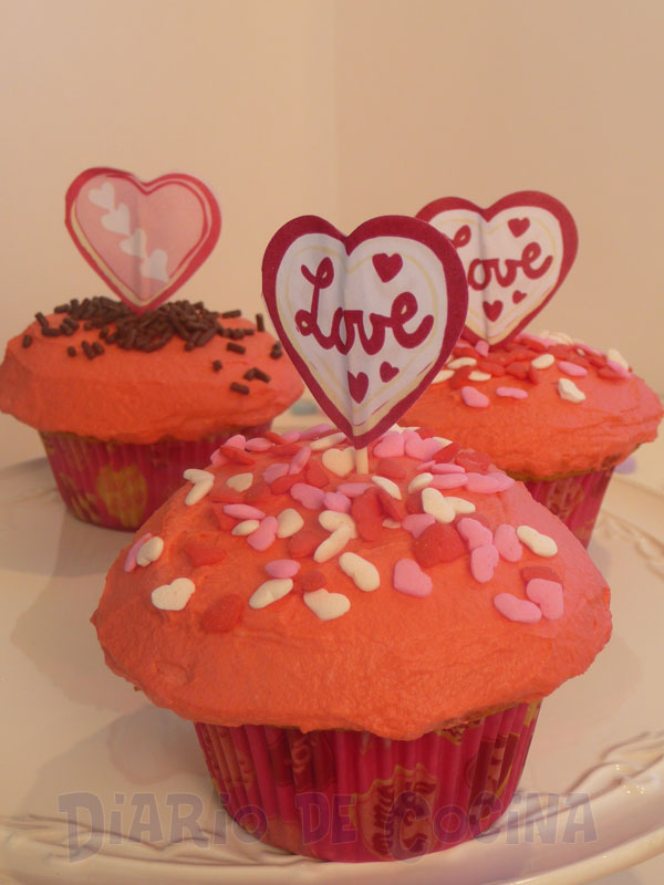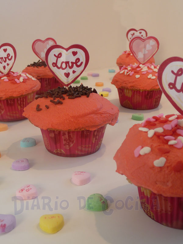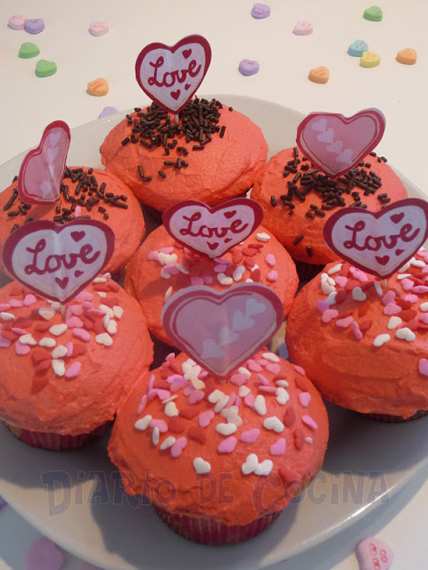 Ahora enfocándonos a la receta que traigo hoy, estos quequitos (cupcakes) son ideales para San Valentín. Lo que encuentro lindo de esta fecha aquí en USA es que no está dirigido únicamente a las parejas, sino a todo aquel que desee expresar muestras de cariño por otro. Es así como en los colegios los niños hacen tarjetitas para sus compañeros o hacen algún tipo de convivencia. Hay un montón de tarjetas para envíar a la familia y amigos.