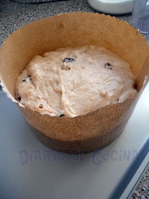 - Vaciar a una molde para pan de pascua o en su efecto un molde de papel como muestro en la foto, esos son ideales también para preparar panettones.