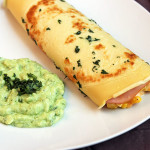 Panqueques con jamón de pavo, maíz y salsa de aguacate