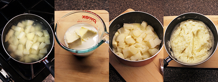 Para este pastel, preparé un tradicional puré de papas. Es importante que al integrar la leche con la mantequilla, estas vayan calientes. Simplemente las pueden calentar en una olla o en un microondas.
