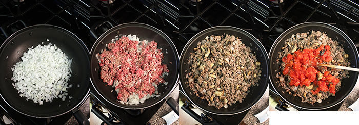- Mientras tanto preparar el pino (relleno basado en carne molida). Para esto, colocar algo de aceite en un sartén, freír la cebolla por unos 4 minutos. Agregar la carne, cocinar unos minutos y añadir los champiñones. Sazonar con los aliños a gusto de uno.
