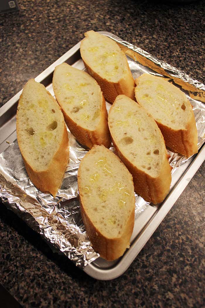 - Cortar el pan baguette en tajadas, rociarlo con aceite de oliva, si quiere también puede agregarle un poco de orégano. Colocarlos en la bandeja del horno a 350°F (180°C) por 8 minutos.