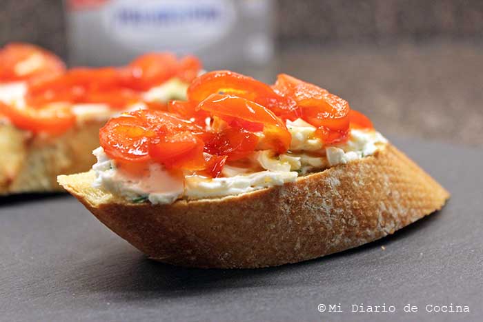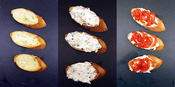 - Montar los crostinis colocando un poco de la mezcla de queso crema en la base del pan, y encima colocar una cucharadita de morrón acaramelado.
