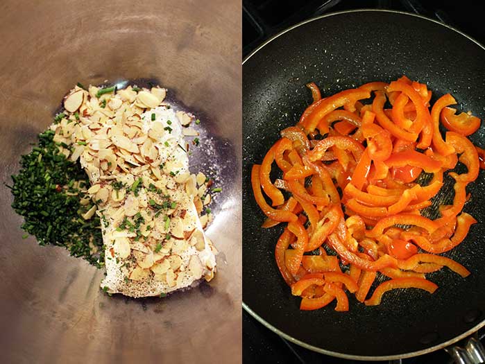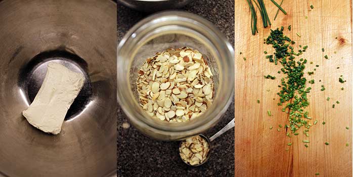 - Mientras tanto, picar el ciboulette finamente, añadirlo al queso crema, además de agregar las almendras.