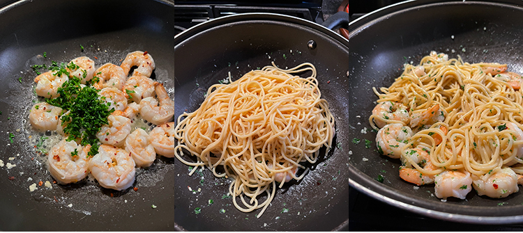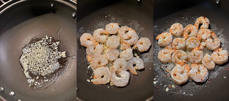 - Calentar el aceite en una sartén antiadherente de 12 pulgadas a fuego medio hasta que empiece a humear. Agregar los camarones y el ajo y cocinar, revolviendo de vez en cuando, hasta que los camarones estén apenas opacos, aproximadamente 4 minutos.