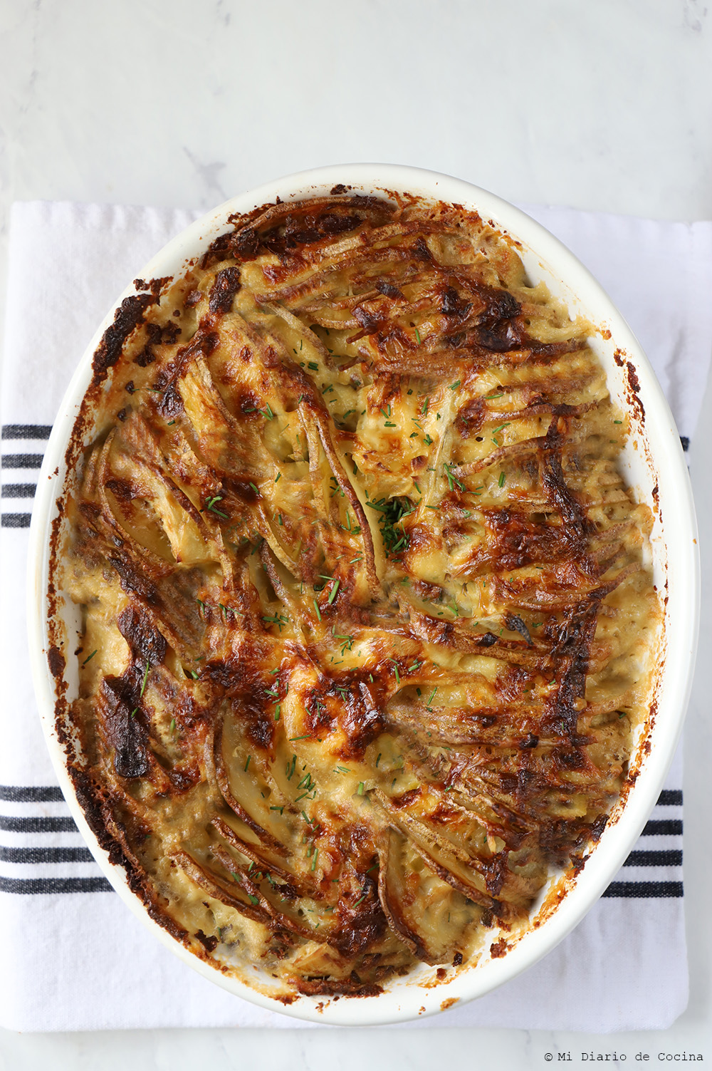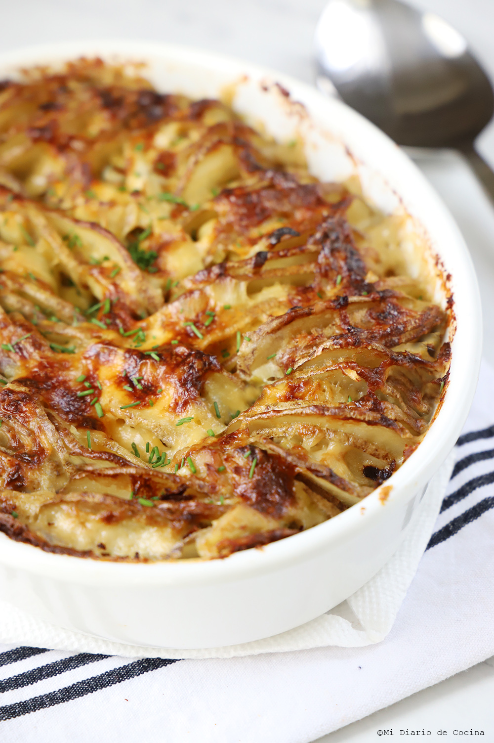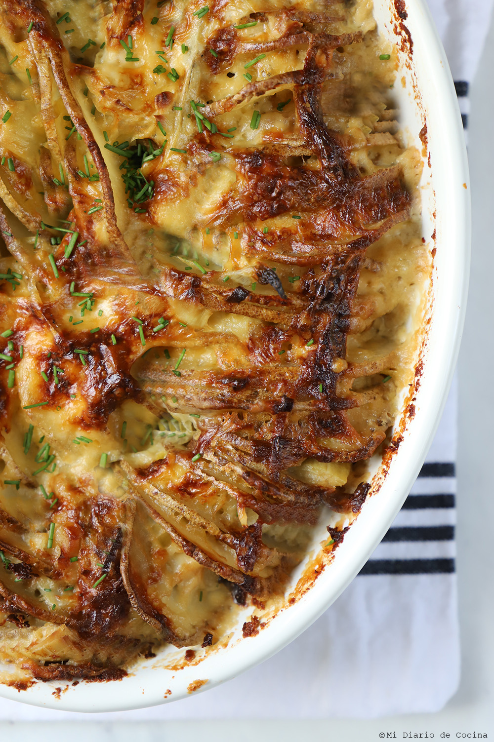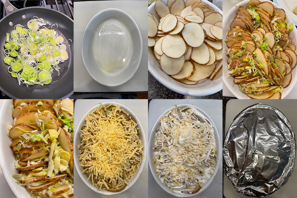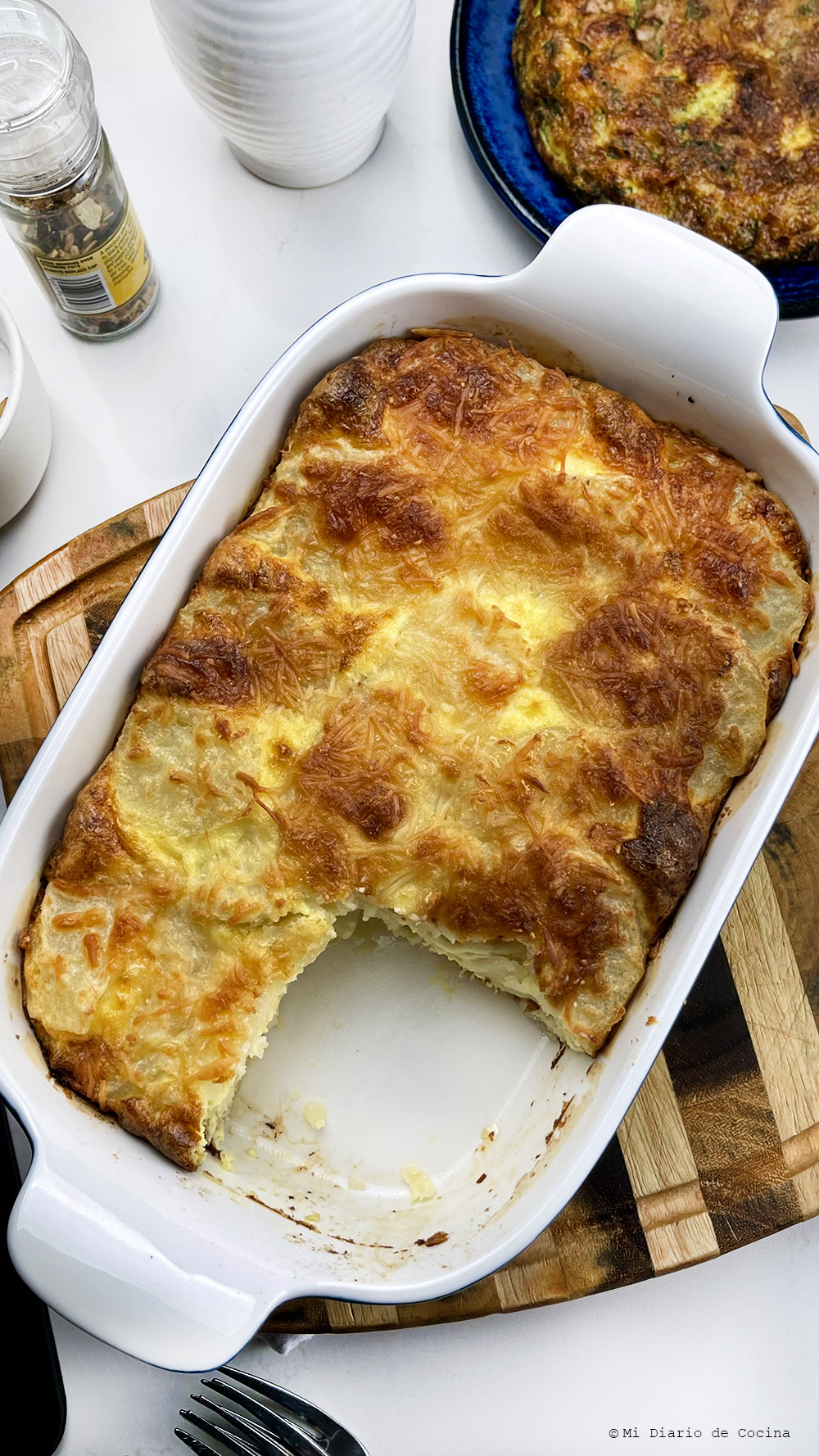 - Continúe colocando capas de ingredientes (condimentando cada capa de papas) y termine con una capa de queso.